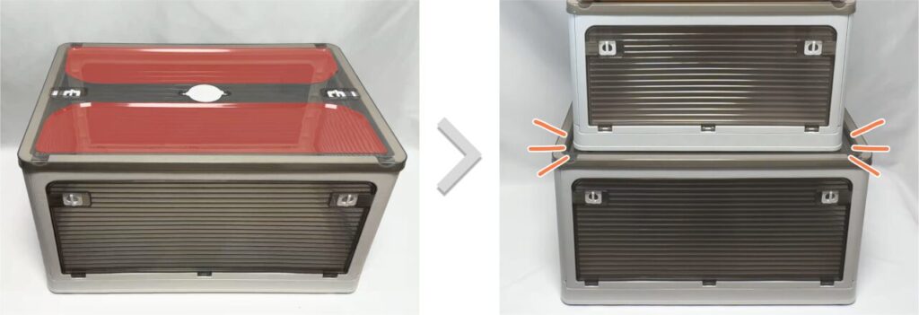 写真のように底以外の方向に「窓」がついているので、ボックスを積み重ねても中にアクセスできます。