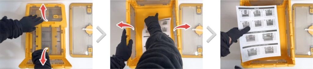 収納ボックスが折りたたまれているので、4ヶ所を開いて「取扱説明書」を取り出します。