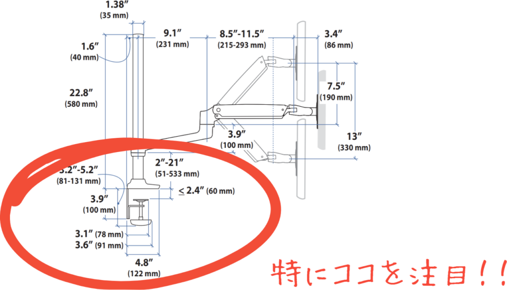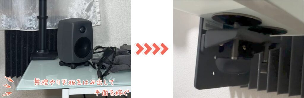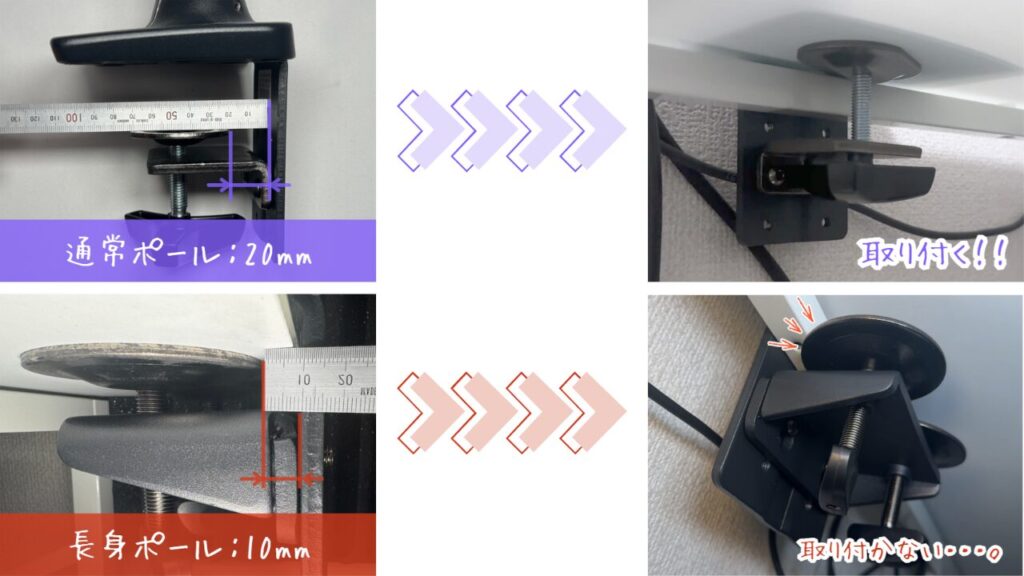 通常ポールで取り付いていたのに、長身ポールに変えるときに机のフレームに接触して焦りました…。今はフレーム外に天板をむりやりズラして取り付けています…。
