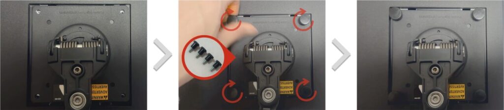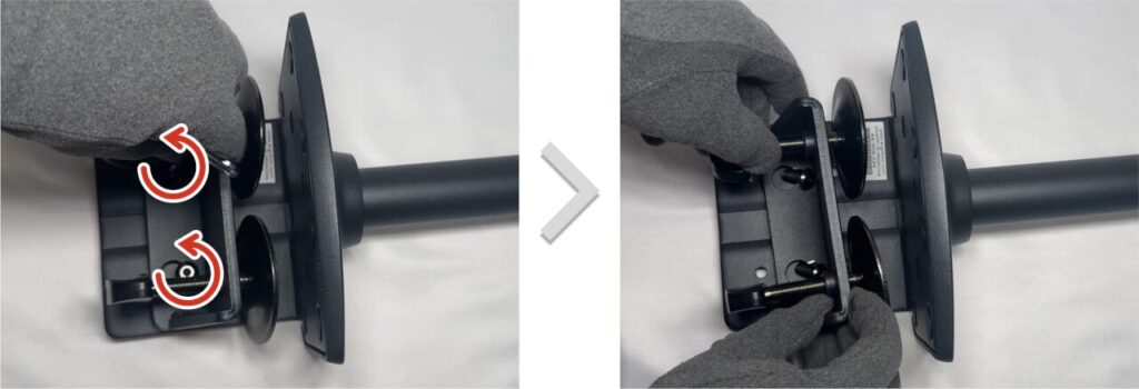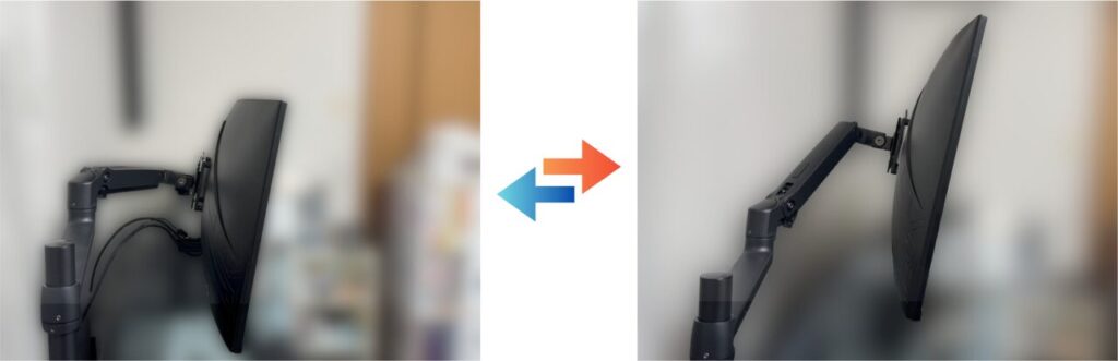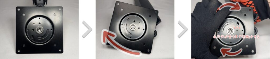 モニターを縦置きで固定する場合は、首を左側に動かなくなるまで振ってから、金具部分を回転させると回ります。その後にネジで固定してください。