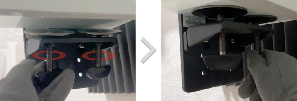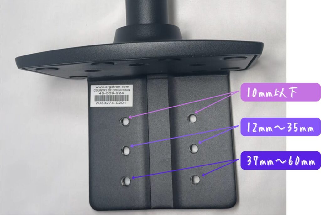 本記事では机の天板が「10mm以下」なので、一番上で固定しています。 - 3机にポールを取り付ける