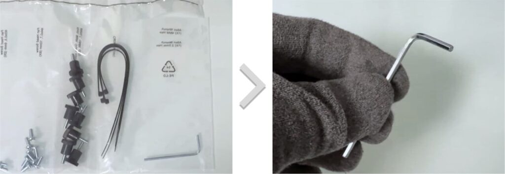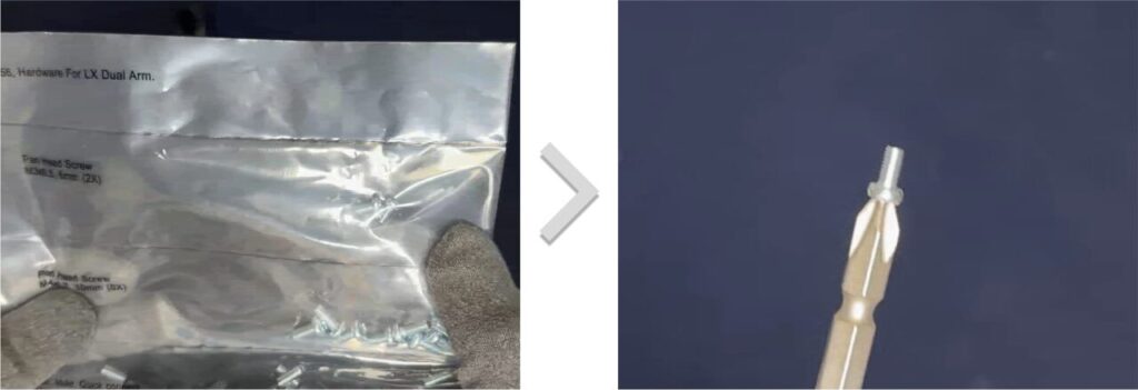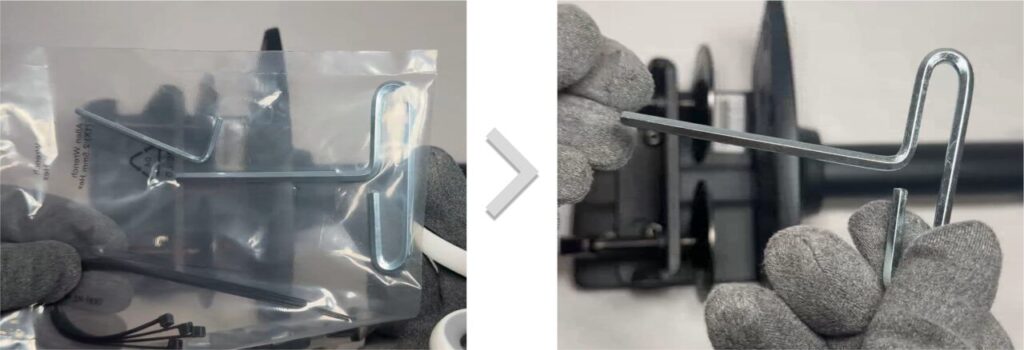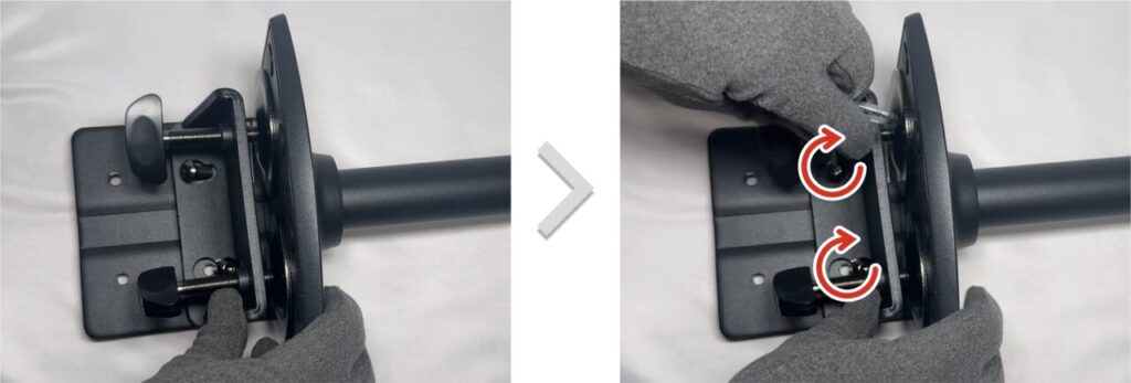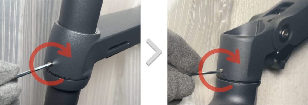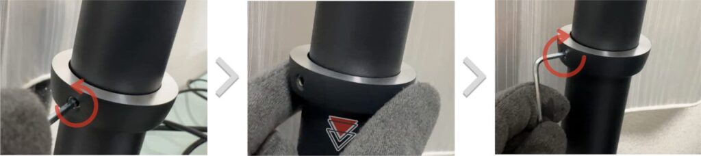 初期状態ではアームが左右に動きやすいので、「エクステンション」と「アーム」の根本のネジを、六角レンチ(小)で固定します。