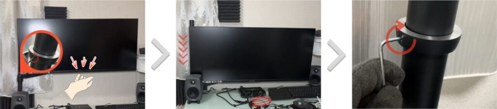 モニターを下から支えながら、ポールカラーのネジをユルめます。