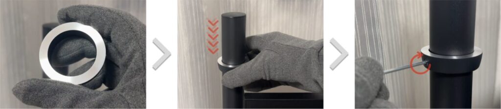 ポールに元から付いている「ポールカラー」側面のネジをユルめて、ポールカラーを最下段に移動させてから固定します。