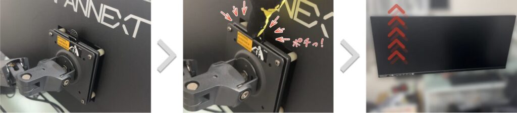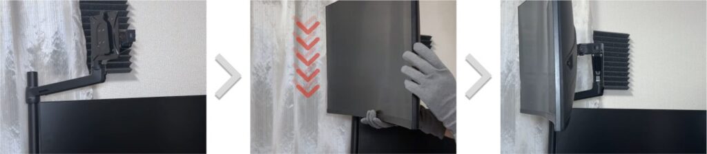 アーム側とモニター側に専用のブラケットを取り付けた後、モニターアームに取り付けます。持ち運びは「モニターのみ」なので、作業が楽になります。