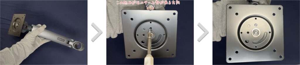 モニターを持ちながら、アームのネジを六角レンチ(大)でユルめてください。