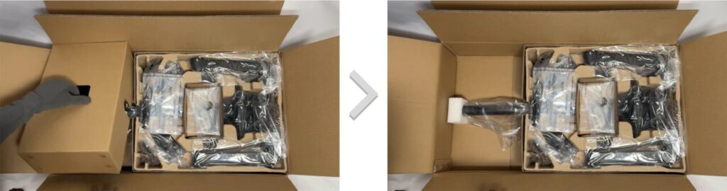 モニターにアームを取り付けた後、「モニター&アーム」を運んで取り付けます。