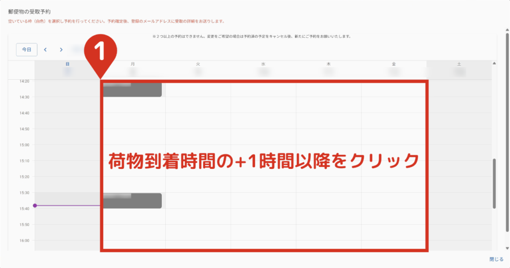 荷物到着時間の後ろの時間より「1時間以上空けて」予約します。