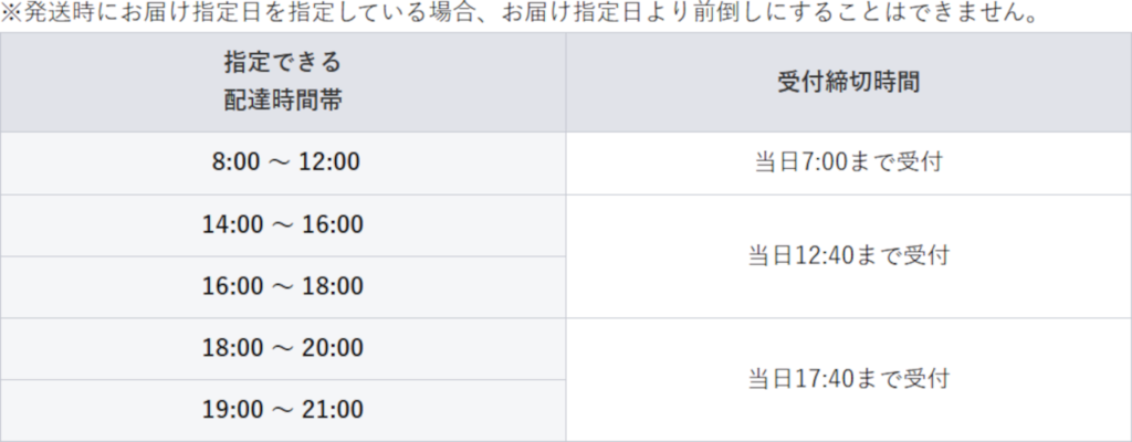 荷物の到着時間には「幅」がありますので、例のように指定するのがオススメです。
