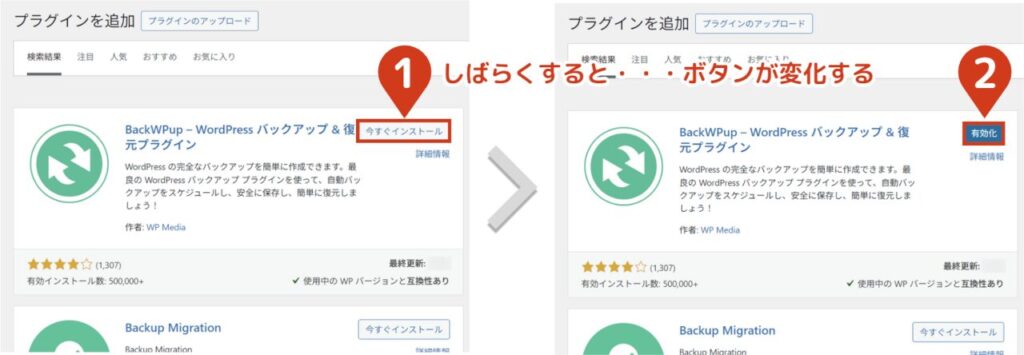 - 4「BackWPup」をインストールし、有効化する検索結果トップに「BackWPup」が表示されるので、今すぐインストールをクリックしてください。 しばらくすると有効化にボタンが変化するので、クリックしてください。  有効化後、自動的に「セットアップ画面」に移動します。