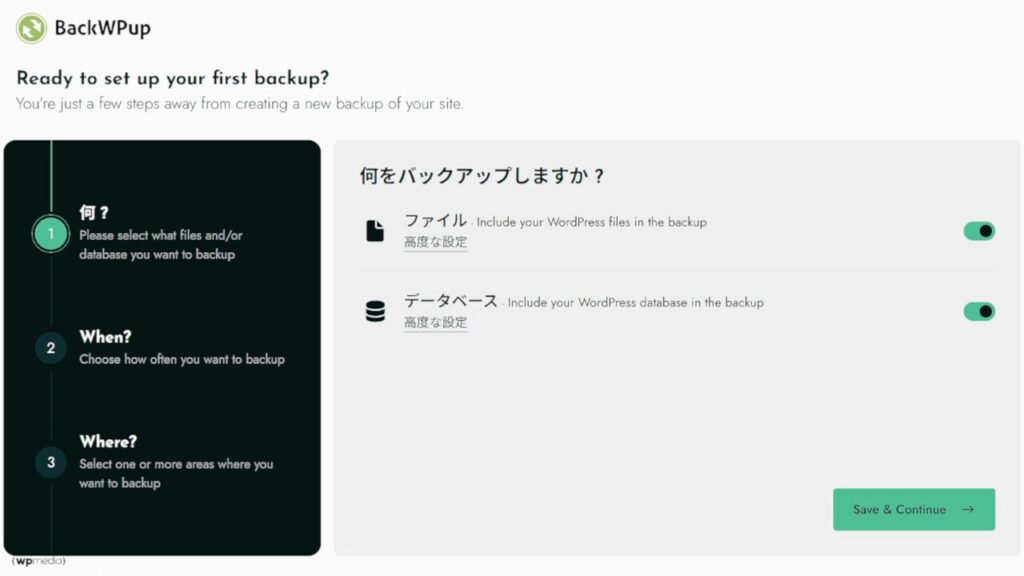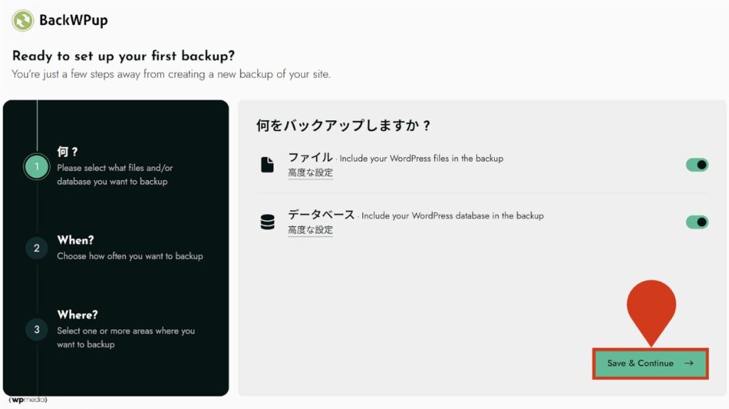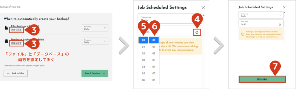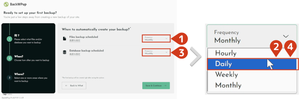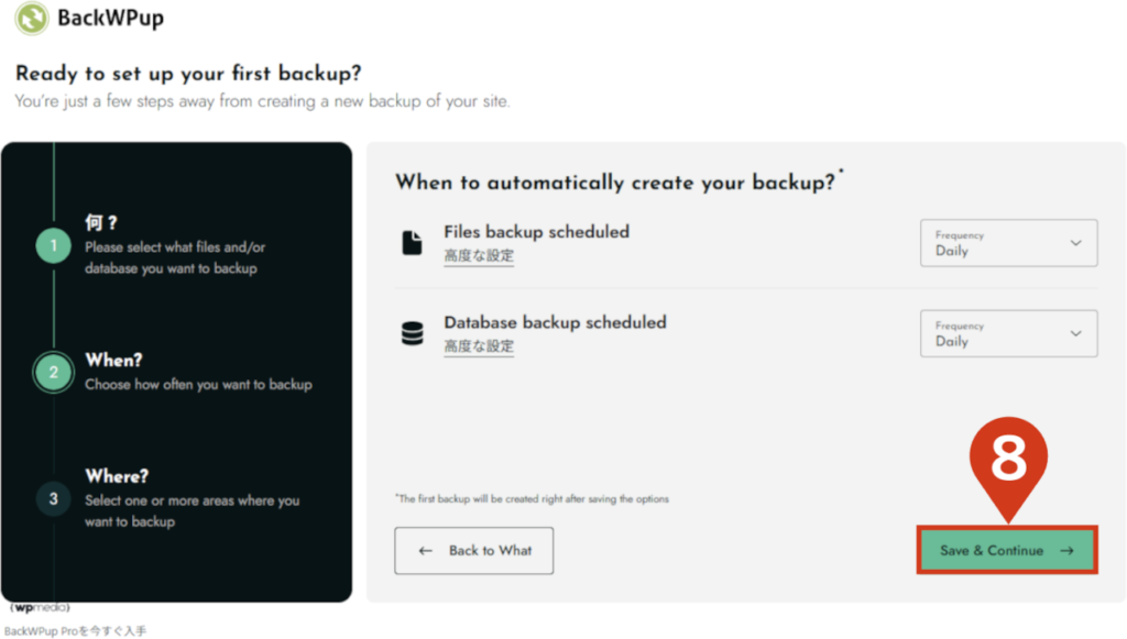 - 2バックアップ頻度と時間を設定するバックアップの設定は、以下を前提に進めていきます。 初期の「月一」だとバックアップ頻度が少なすぎるため、「毎日」に変更します。  高度な設定で、バックアップ時間を設定します。  設定後、Save & Continueをクリックします。