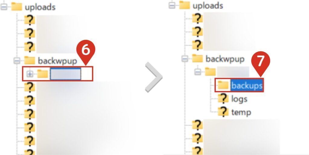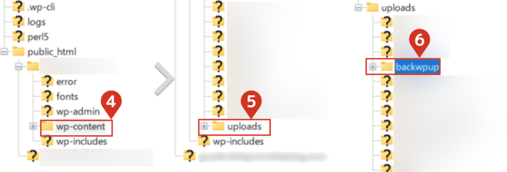 - 4サーバー側でバックアップフォルダにアクセスする「public_html」→「ドメインフォルダ」を選択してください。  続いて「wp-content」→「uploads」→「backwpup」に移動します。  最後に「backwpupの直下のフォルダ」の「backups」をクリックして選択します。