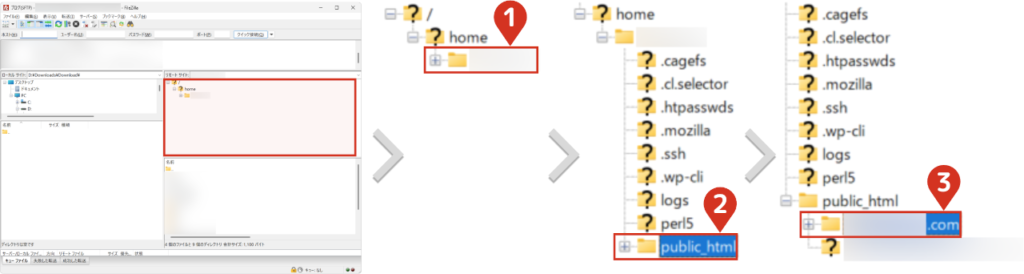 - 3サーバー側でドメインフォルダにアクセスする「public_html」→「ドメインフォルダ」を選択してください。