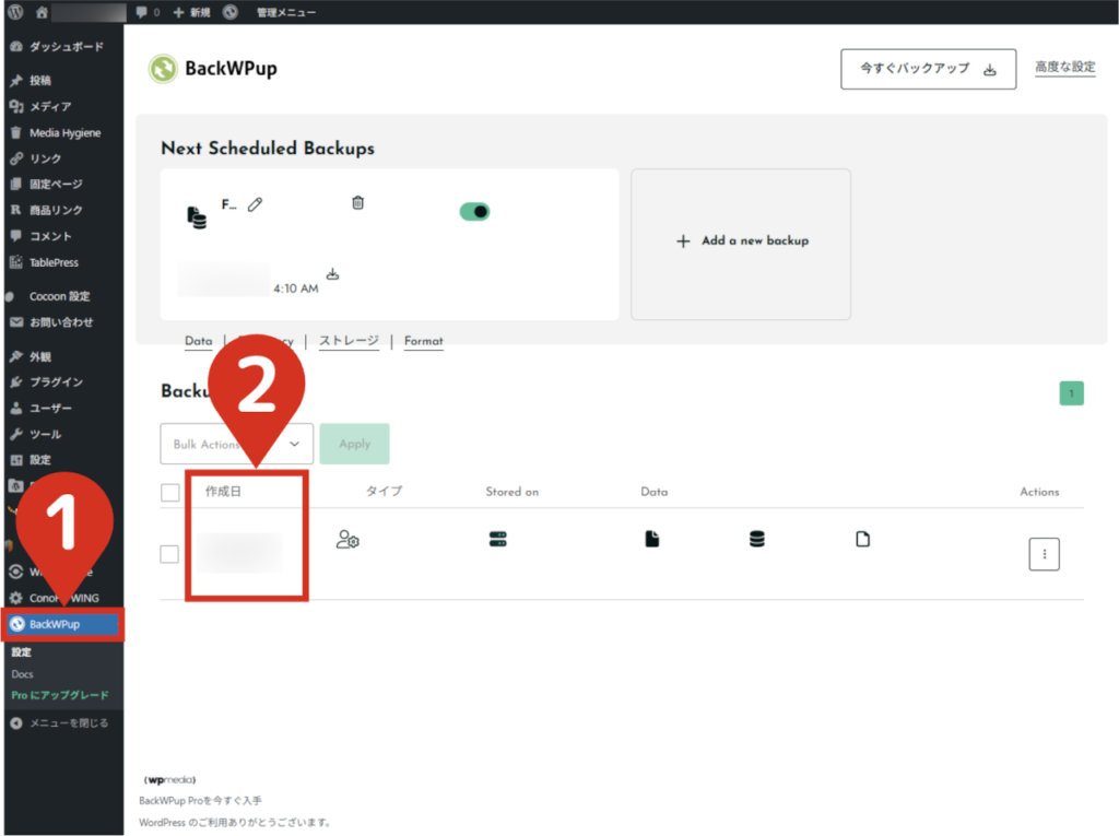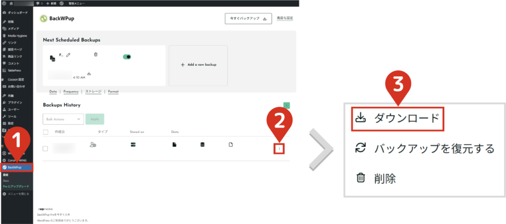 - 1BackWPupのバックアップ履歴から、作成日を確認する復元したいバックアップファイルを確認します。