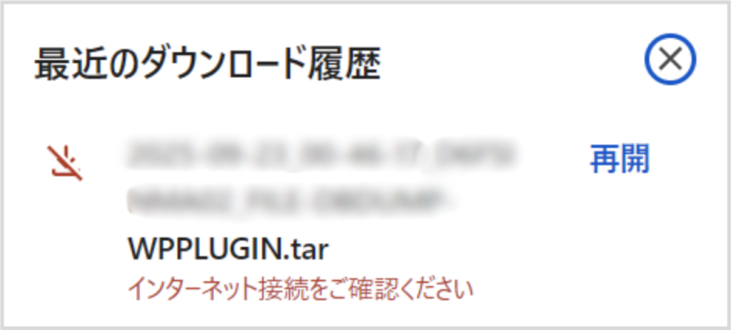 まずはファイル名からバックアップ日を確認します。 ダウンロードしたいファイルを「ダブルクリック」すると、ダウンロードが開始されます。  しばらく待って以下の表示になれば、ダウンロード完了となります。  FTP/SFTPからバックアップファイルをダウンロードする方法は、以上となります。