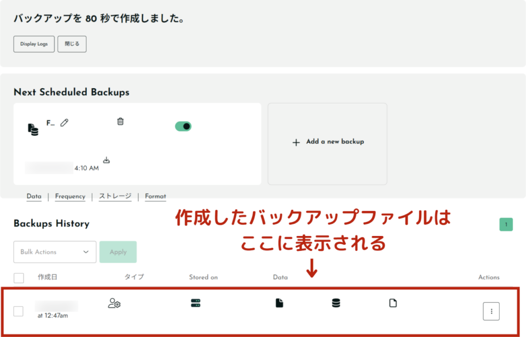 - 2バックアップが開始される作成したバックアップ設定で、バックアップがはじまります。   10GBで約80秒くらいです。はやい! 作成したバックアップファイルは、画面下に表示されます。  すぐにバックアップする方法は、以上となります。