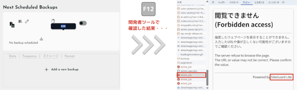 Conoha Wingプラグインで「WAF」を解除して削除ボタンを押したところ、見事ジョブを削除することに成功しました。
