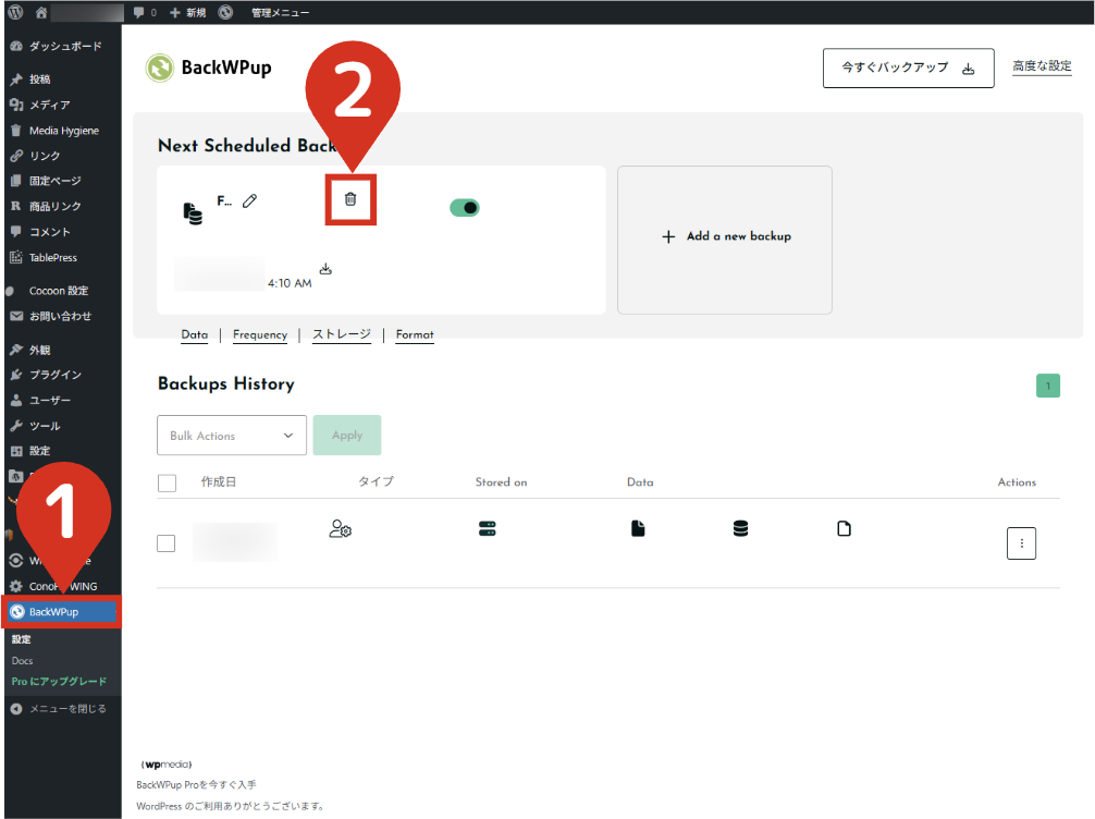 - 2BackWPupのジョブを削除する削除したいジョブの「ゴミ箱マーク」をクリックします。