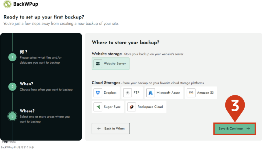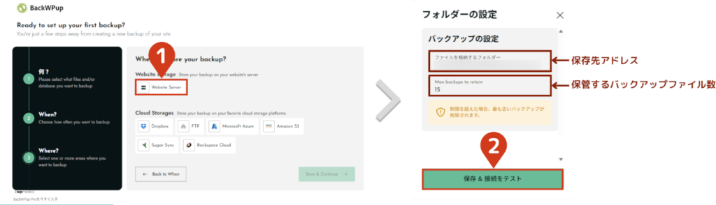 - 3バックアップファイルの保存先を設定する「Website Server」を選択後、そのまま保存 & 接続をテストをクリックします。   保存先と保管するバックアップファイル数は、お好みで調整してください。初期設定だと15個 = 15日(約2週間分)保管されます。 設定後、Save & Continueをクリックします。