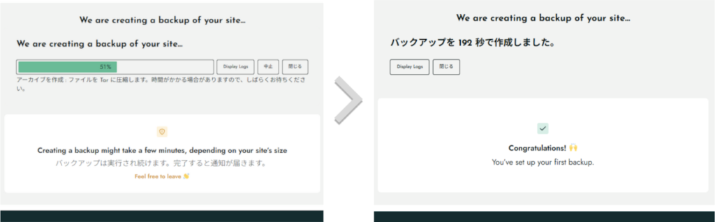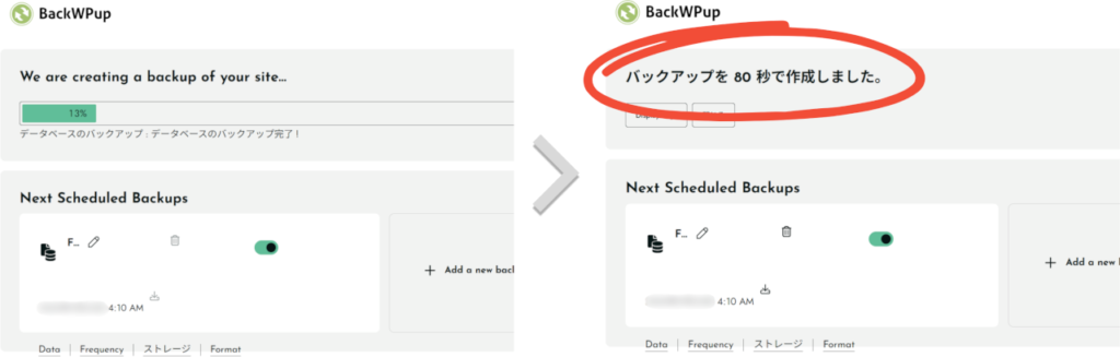 しばらくすると、完了します。  Ver.5になってから、セットアップが格段にわかりやすくなりました!前は少しとっつきにくかった印象です。 自動バックアップの設定は、以上となります。 これで指定した時間にバックアップを取ってくれるようになります。