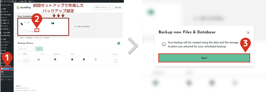 - 1BackWPup画面のアイコンをクリックするサイドメニューの「BackWPup」を選択後、バックアップ設定内のアイコンをクリックします。 「作成しますよ」という確認メッセージが表示されるので、Startを選択します。