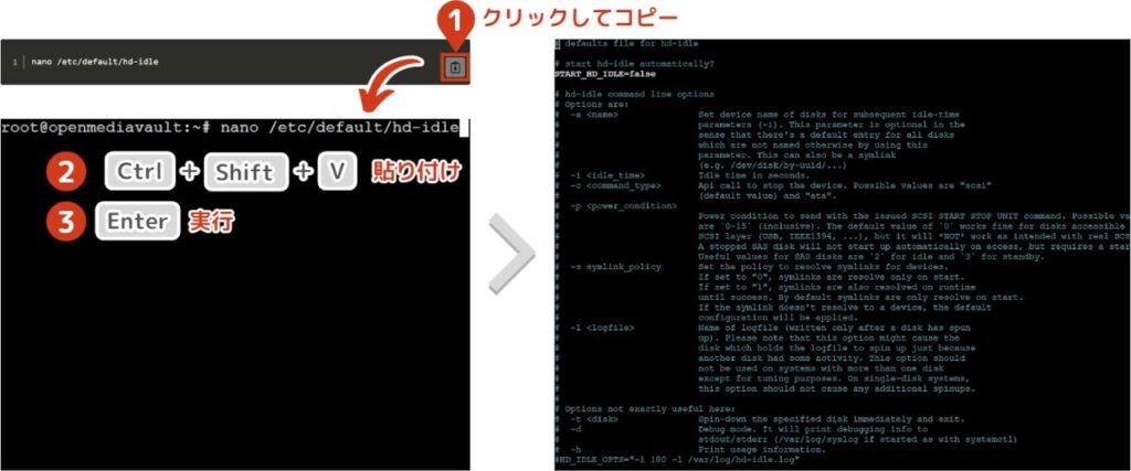 # 設定ファイルの編集 nano /etc/default/hd-idle # hd-idleの再起動 systemctl restart hd-idle「hd-idle」でのスピンダウン設定は、以上となります。