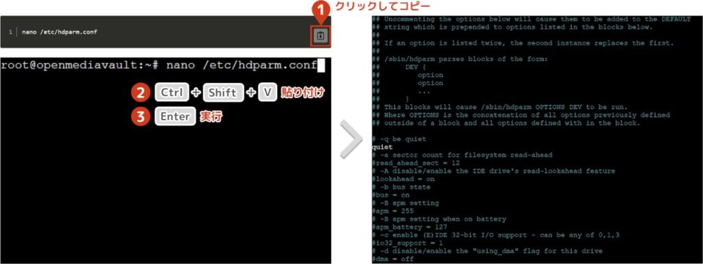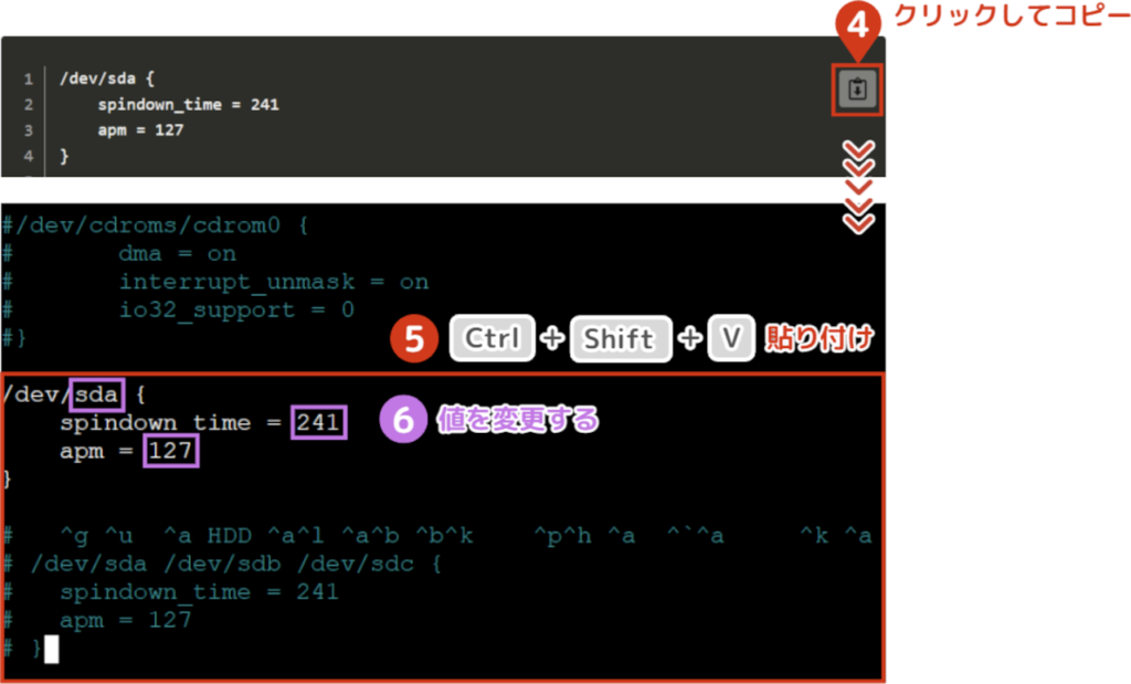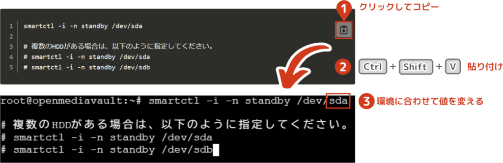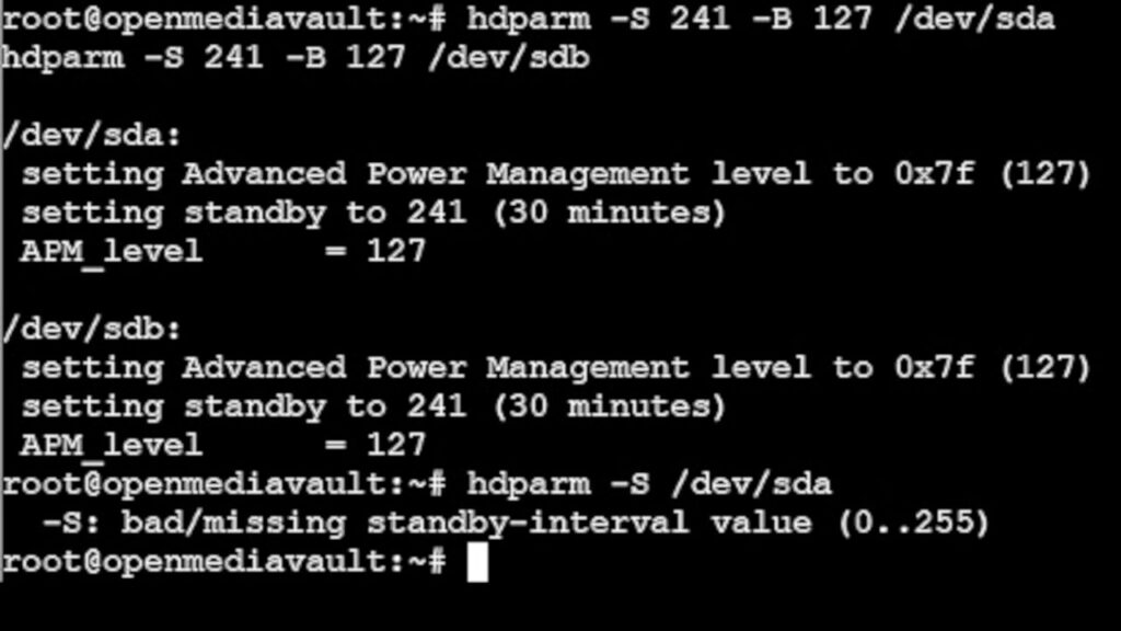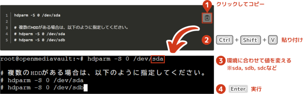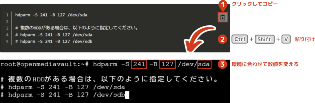 hdparm -S 0 /dev/sda # 複数のHDDがある場合は、以下のように指定してください。 # hdparm -S 0 /dev/sda # hdparm -S 0 /dev/sdbデバイス部分を環境に合わせて編集し、コードを実行します。
