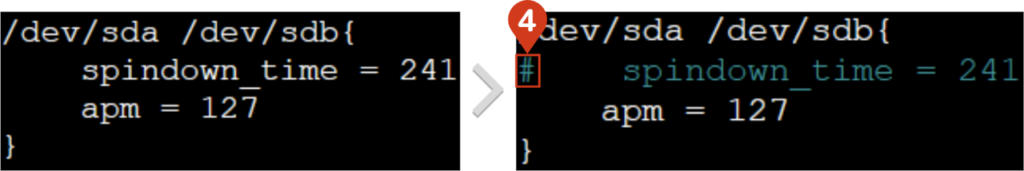/dev/sda { spindown_time = 241 apm = 127 } # 複数のHDDがある場合は、以下のように指定してください。 # /dev/sda /dev/sdb /dev/sdc { # spindown_time = 241 # apm = 127 # }値を先程スピンダウンした内容に変更します。