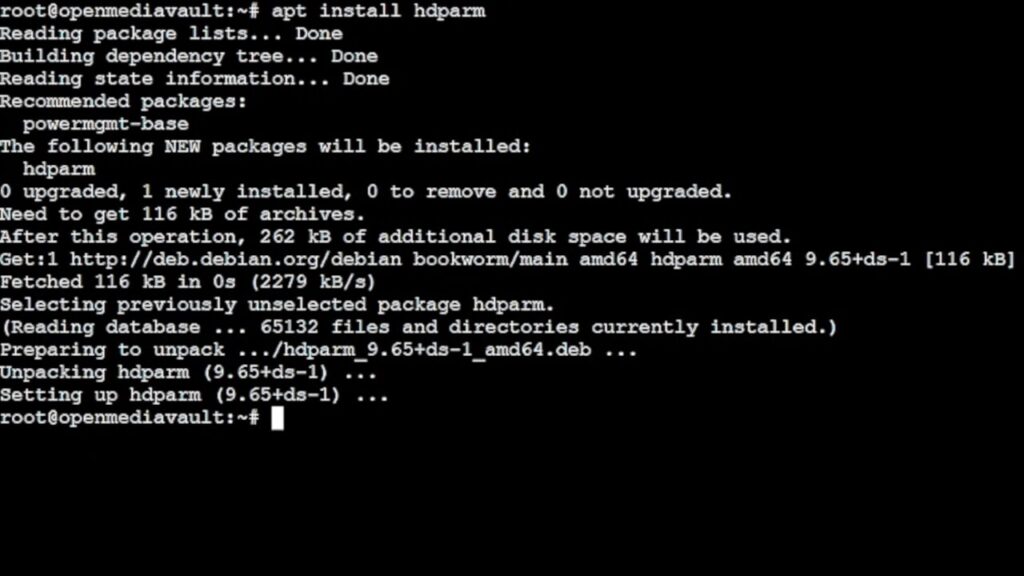 apt install hdparmインストールが完了すると、以下のような画面になります。