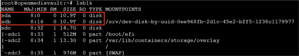 lsblk同時にスピンダウンするデバイス名を、メモ帳などに控えておきます。