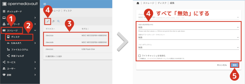 「hdparm」や「hd-idle」を使うにあたり、OMV側のスピンダウン設定を無効化しておきましょう。設定が競合すると不具合が発生し、HDDの故障につながる可能性があります。