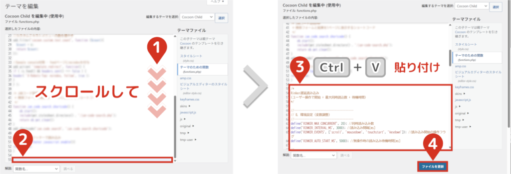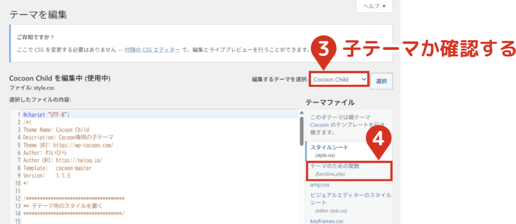 編集するテーマが「Cocoon Child(子テーマ)」になっていることを確認してから、「functions.php」を選択します。