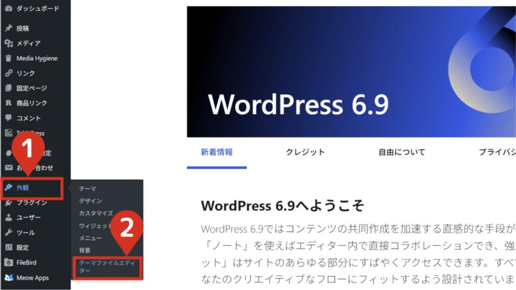 WordPressの管理画面から「外観」→「テーマファイルエディター」に移動します。