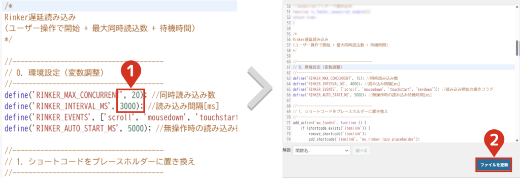 /* Rinker遅延読み込み (ユーザー操作で開始 + 最大同時読込数 + 待機時間) */ //-------------------------------------- // 0. 環境設定(変数調整) //-------------------------------------- define('RINKER_MAX_CONCURRENT', 20); //同時読み込み数 define('RINKER_INTERVAL_MS', 3000); //読み込み間隔[ms] define('RINKER_EVENTS', ['scroll', 'mousedown', 'touchstart', 'keydown']); //読み込み開始の操作フラグ define('RINKER_AUTO_START_MS', 5000); //無操作時の読み込み待機時間[ms] //-------------------------------------- // 1. ショートコードをプレースホルダーに置き換え //-------------------------------------- add_action('wp_loaded', function () { if (shortcode_exists('itemlink')) { remove_shortcode('itemlink'); add_shortcode('itemlink', 'my_rinker_lazy_placeholder'); } }, 100); function my_rinker_lazy_placeholder($atts) { if (empty($atts['post_id'])) { return ''; } $json_atts = esc_attr(json_encode($atts)); return sprintf( '<div class="rinker-placeholder" data-atts="%s">読み込み中...</div>', $json_atts ); } //-------------------------------------- // 2. Ajax リクエスト処理 //-------------------------------------- add_action('wp_ajax_rinker_load_action', 'my_rinker_ajax_handler'); add_action('wp_ajax_nopriv_rinker_load_action', 'my_rinker_ajax_handler'); function my_rinker_ajax_handler() { $atts = json_decode(stripslashes($_POST['atts'] ?? ''), true); if (!empty($atts) && class_exists('Yyi_Rinker_Plugin')) { echo Yyi_Rinker_Plugin::get_object()->shotcode($atts); } wp_die(); } //-------------------------------------- // 3. JavaScript:ユーザー操作で遅延読み込み開始 //-------------------------------------- add_action('wp_footer', function () { ?> <style> .rinker-placeholder { min-height: 150px; margin: 20px 0; display: flex; align-items: center; justify-content: center; background: #f9f9f9; border: 1px solid #eee; border-radius: 4px; color: #999; font-size: 14px; } </style> <script> (function () { const MAX_CONCURRENT = <?php echo RINKER_MAX_CONCURRENT; ?>; const INTERVAL_MS = <?php echo RINKER_INTERVAL_MS; ?>; const EVENTS = <?php echo json_encode(RINKER_EVENTS); ?>; const AUTO_START_MS = <?php echo RINKER_AUTO_START_MS; ?>; const queue = []; let activeCount = 0; let started = false; async function processQueue() { if (queue.length === 0 || activeCount >= MAX_CONCURRENT) return; activeCount++; const el = queue.shift(); const body = new URLSearchParams({ action: 'rinker_load_action', atts: el.dataset.atts }); try { const res = await fetch('<?php echo admin_url("admin-ajax.php"); ?>', { method: 'POST', headers: { 'Content-Type': 'application/x-www-form-urlencoded' }, body: body.toString() }); if (res.ok) { const html = (await res.text()).replace(/0$/, '').trim(); if (html) el.outerHTML = html; } } catch (e) { console.error('Rinker Load Error:', e); } finally { activeCount--; setTimeout(processQueue, INTERVAL_MS); } } function startLoading(event) { if (started) return; if (event && event.type === 'scroll' && window.scrollY < 50) return; started = true; cleanup(); const placeholders = document.querySelectorAll('.rinker-placeholder'); placeholders.forEach(el => queue.push(el)); for (let i = 0; i < MAX_CONCURRENT; i++) { processQueue(); } } function cleanup() { if (Array.isArray(EVENTS)) { EVENTS.forEach(ev => window.removeEventListener(ev, startLoading)); } } setTimeout(() => { if (Array.isArray(EVENTS)) { EVENTS.forEach(ev => window.addEventListener(ev, startLoading, { passive: true }) ); } }, 1000); setTimeout(() => { startLoading(); }, AUTO_START_MS); })(); </script> <?php }, 100); - 2「functions.php」にアクセスする