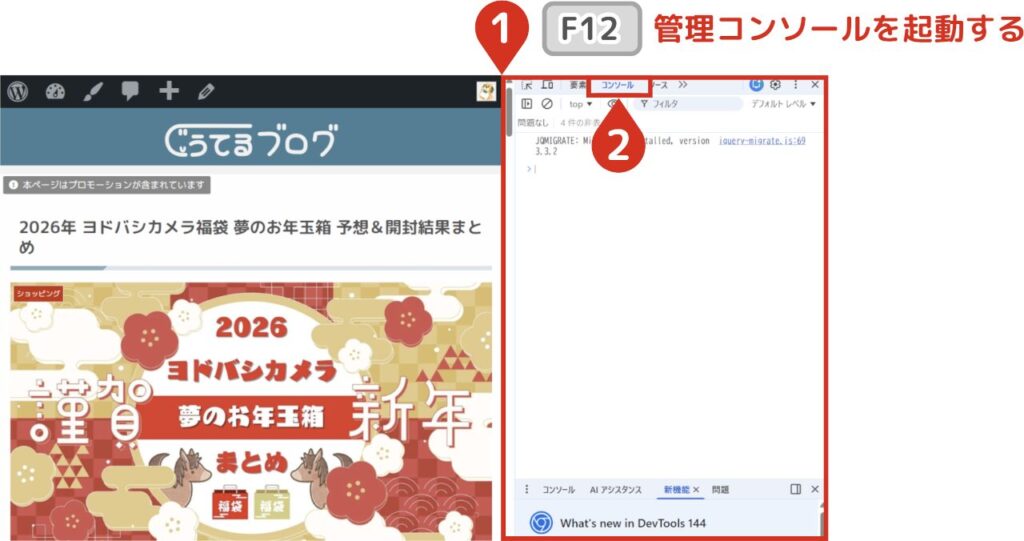 F12で開発者ツールを起動後、「コンソールタブ」をクリックします。