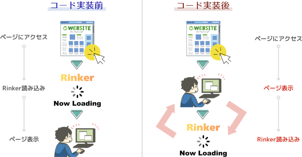 次の項目で詳しく説明していますが、Rinkerの読み込みを後回しにしているため、不完全なページのレイアウトの状態をユーザーに見られてしまう可能性があります。