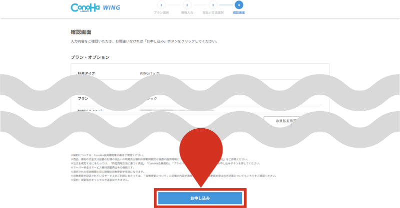 今まで選択した内容の一覧が表示されるので、間違いがないか確認してからお申し込みをクリックします。