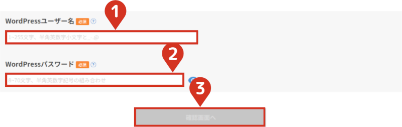 先程は「ConoHa」のログイン情報を設定しましたが、こちらは「WordPress」のログイン情報の設定になります。
