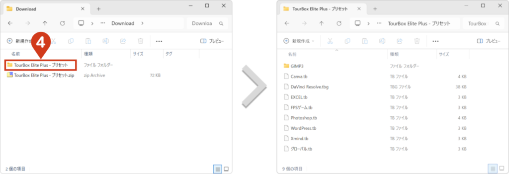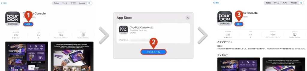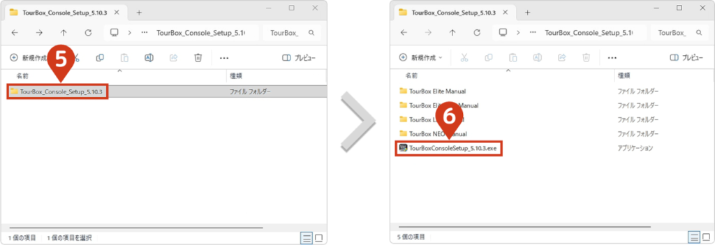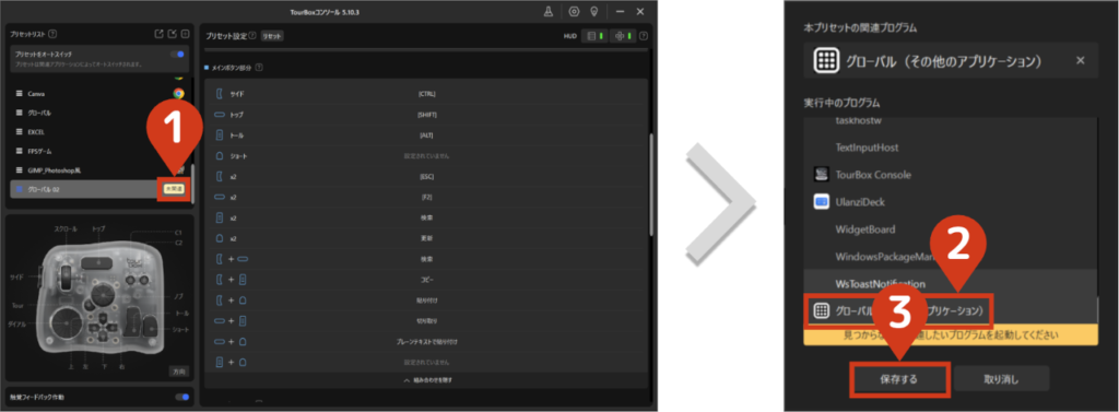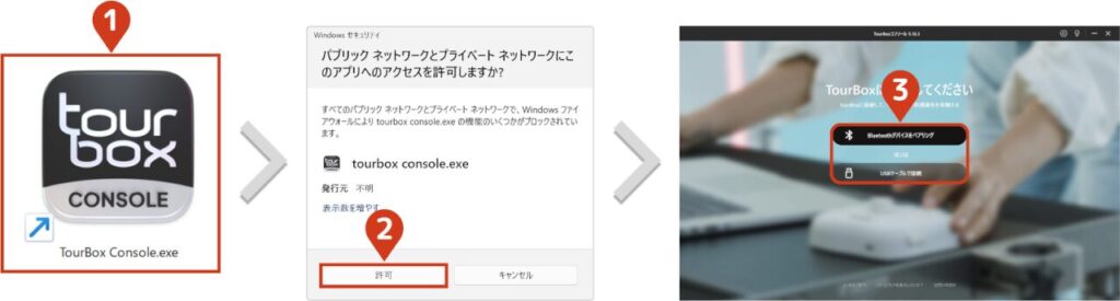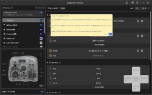 解凍したファイルを実行後、右上のメニューから「TourBox」アプリを起動します。