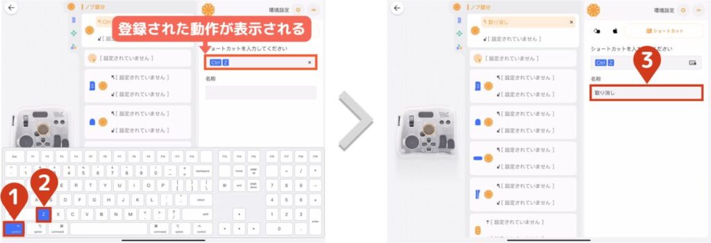ショートカットでCtrl+Zの登録を例に説明すると、「キーボード」が表示されるので、タップして組み合わせていきます。