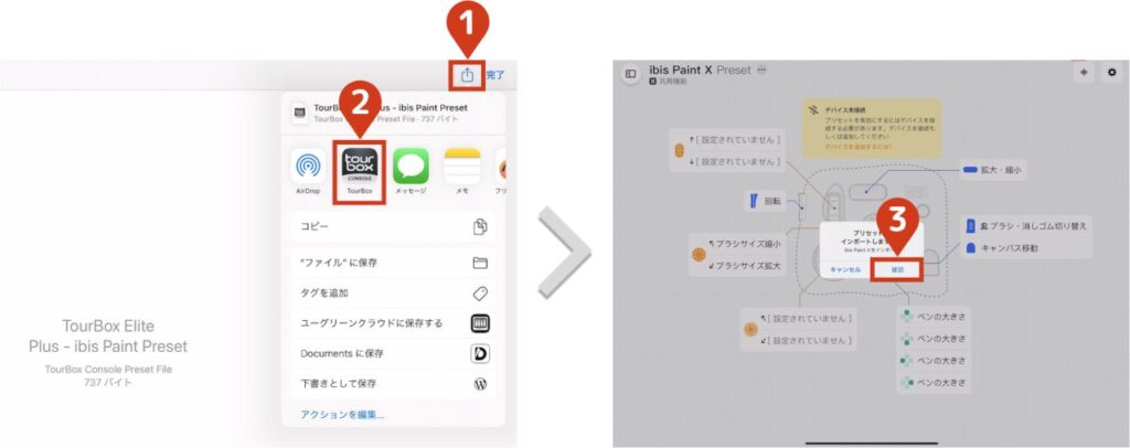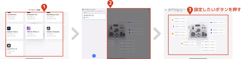 今回は「カスタマイズ」を選択しています。図の順番にタップして、プリセット設定画面に移動します。