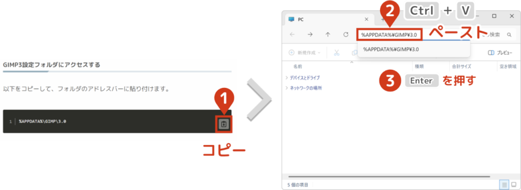 %APPDATA%\GIMP\3.0適当なフォルダを開き、アドレスバーに貼り付けてからEnterクリックします。