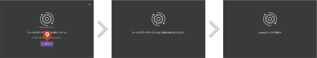 本体のファームウェアが古い場合は、自動でアップデート画面が表示されるので、スタートをクリックして更新します。