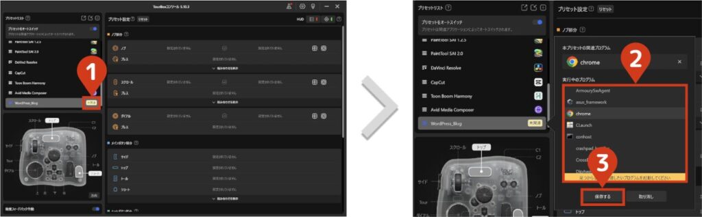 ※今回は例として、ブログ作成ツール「WordPress」のプリセットを作成するため「Google Chrome」を指定しています。