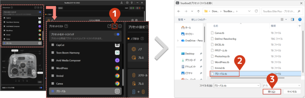 画面左上の をクリックし、ダウンロードしたプリセットファイルを選択します。