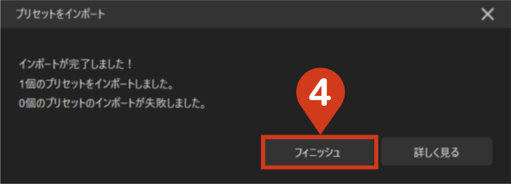 インポート完了後、フィニッシュをクリックしてウインドウを閉じます。