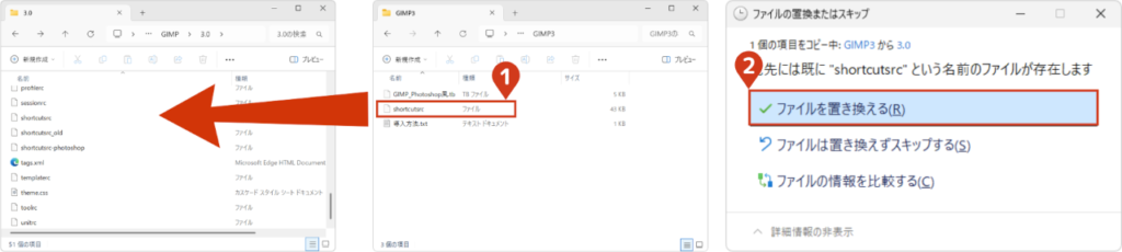 ダウンロードしたプリセットに同封されている「shortcutsrc」というファイルを上書きします。