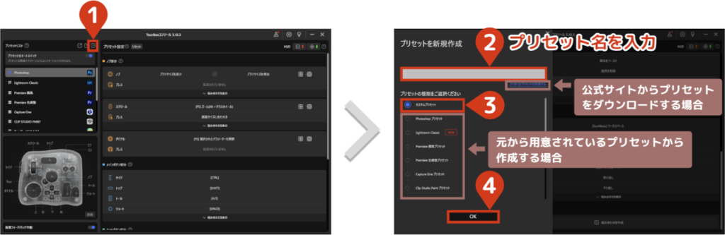わかりやすいプリセット名を入力後、「カスタムプリセット」を選択してからOKを選択します。