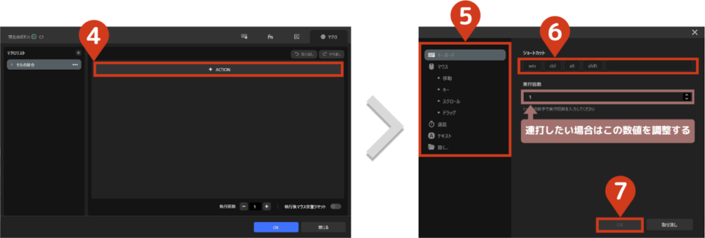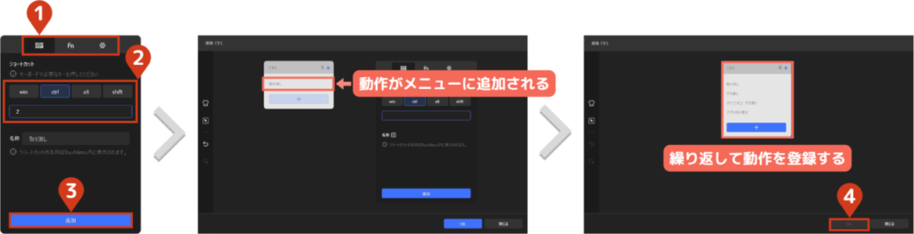 本設定ではキーボード入力だけではなく、様々なアクションを登録できます。