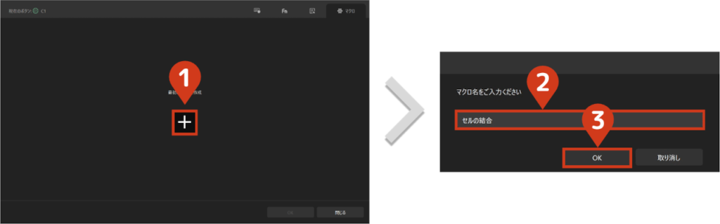 ※例ではExcelの「セル結合・解除」の動作をマクロで再現しています。をクリックしてわかりやすいマクロ名を入力後、OKをクリックします。